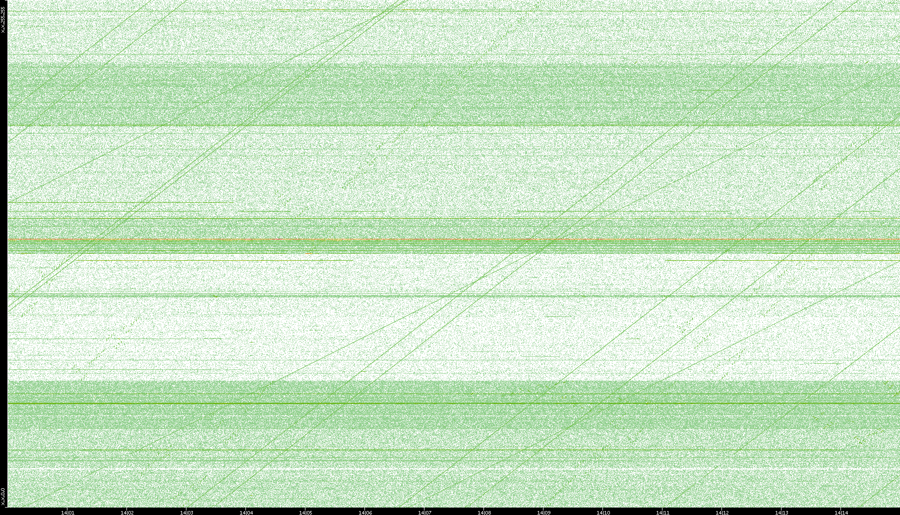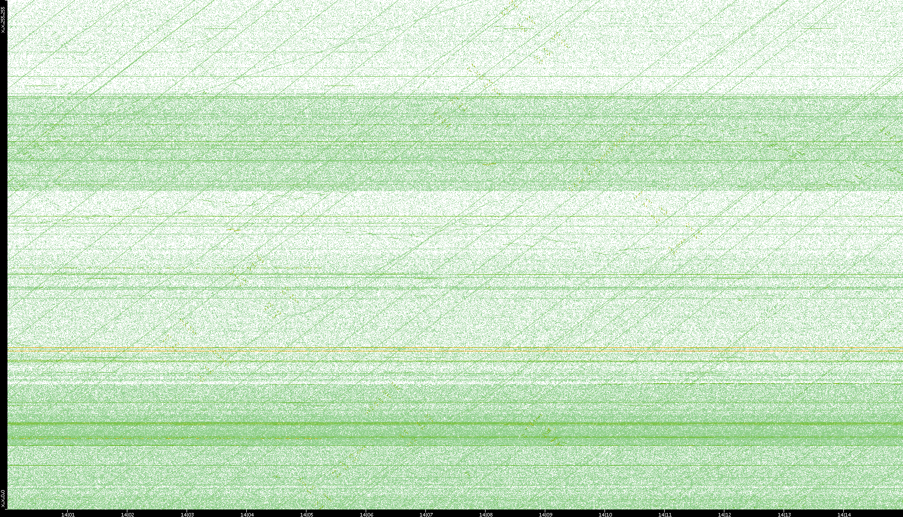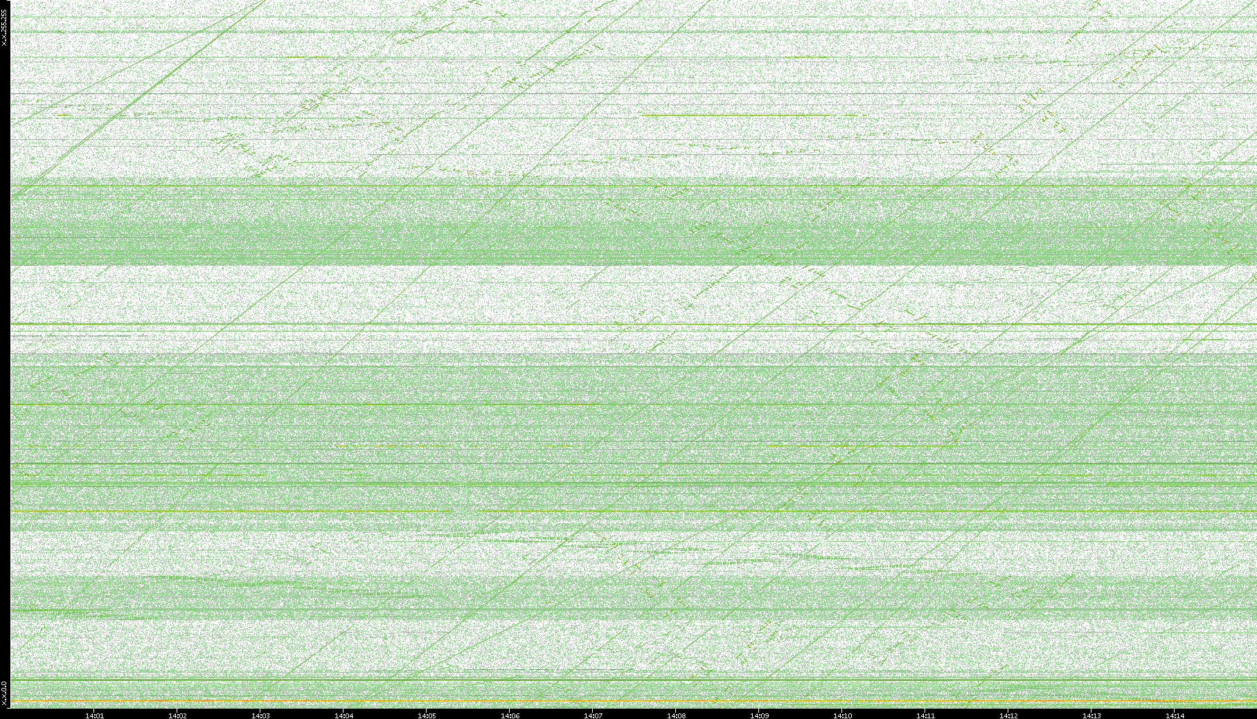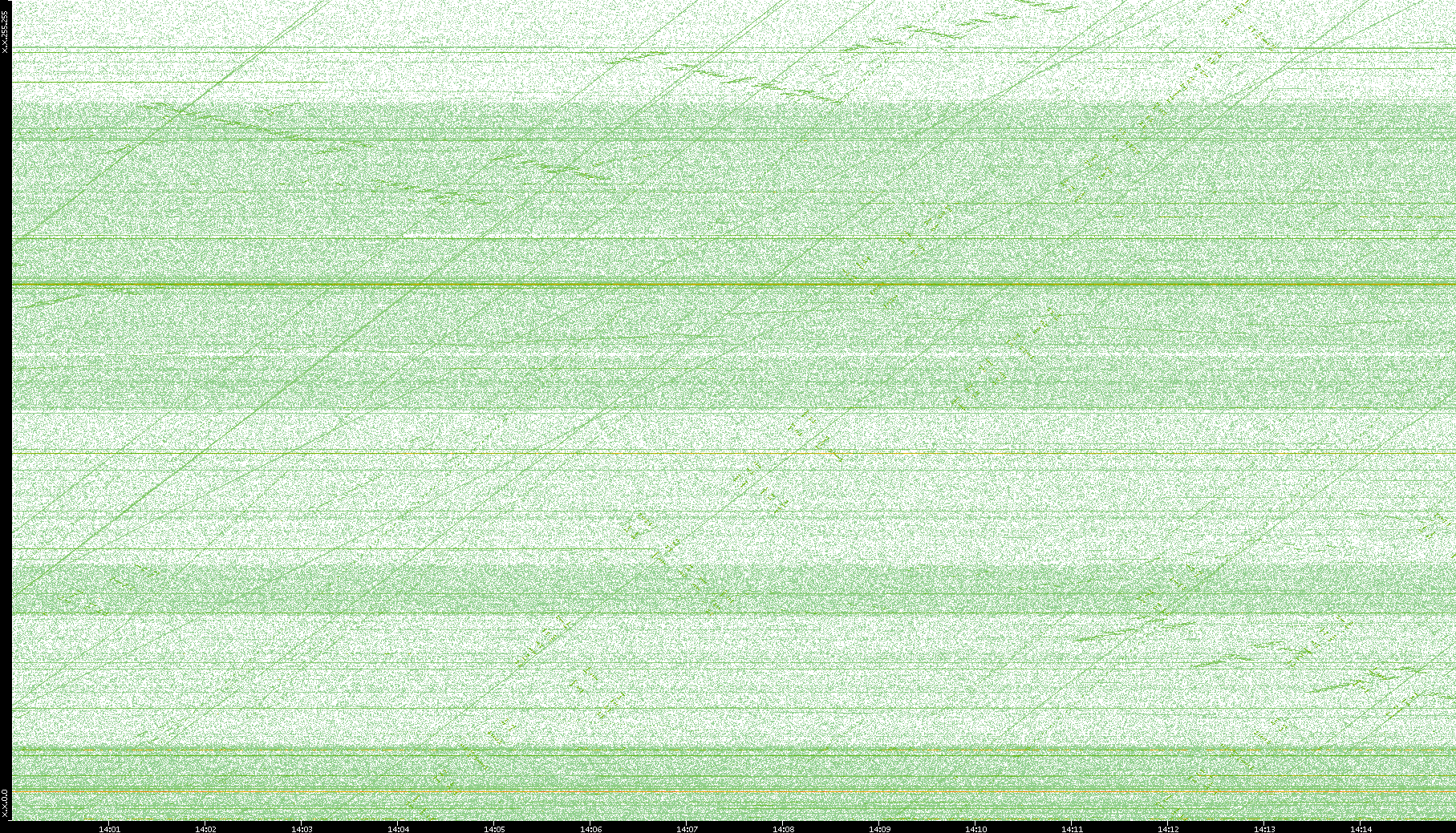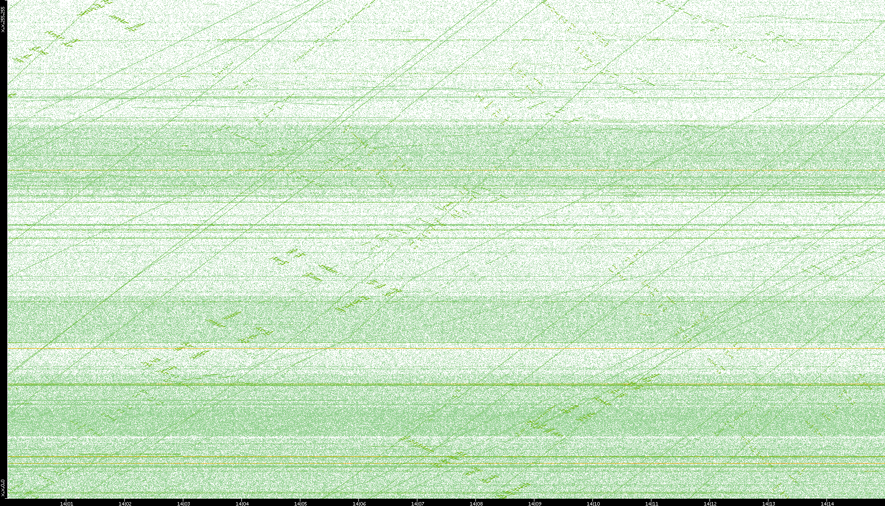 2003/10/14 Dest. IP vs. Time Dest. Port vs. Time Src. IP vs. Time Src. Port vs. Time Nb. of Packets vs. Time Throughput vs. Time Average Packet Size vs. Time Entropy of Port vs. Time