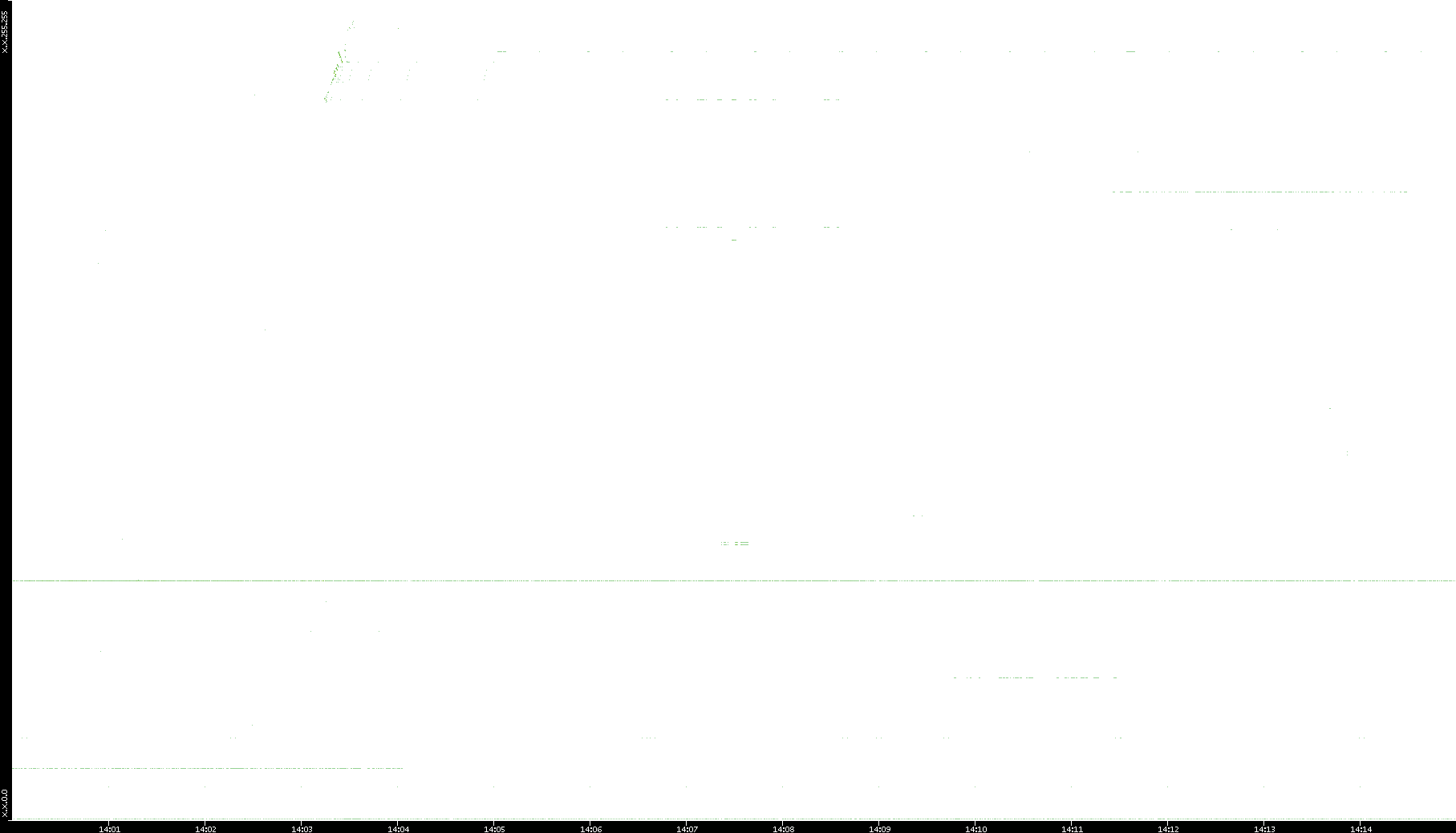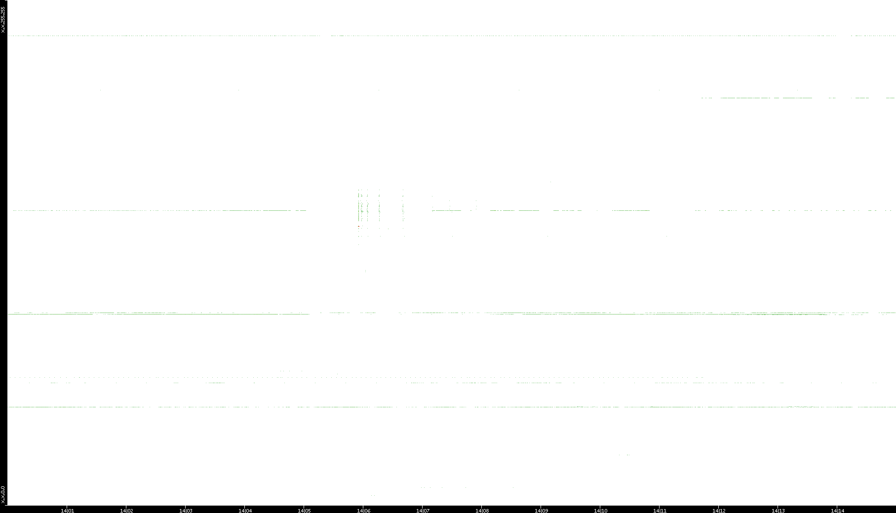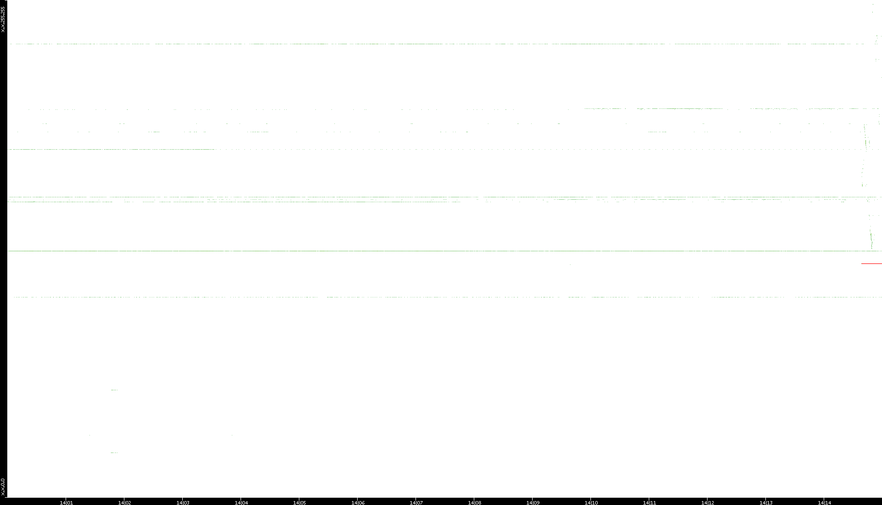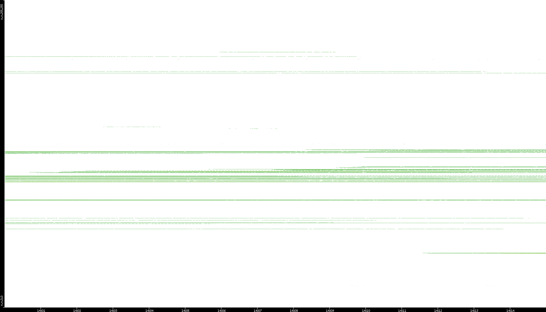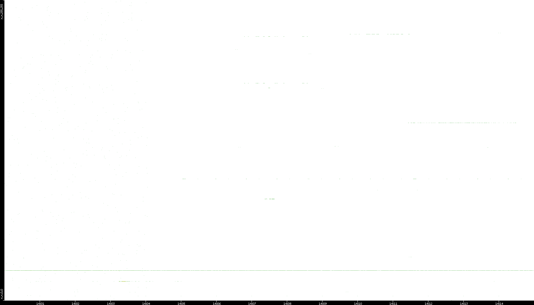 2005/07/08 Dest. IP vs. Time Dest. Port vs. Time Src. IP vs. Time Src. Port vs. Time Nb. of Packets vs. Time Throughput vs. Time Average Packet Size vs. Time Entropy of Port vs. Time