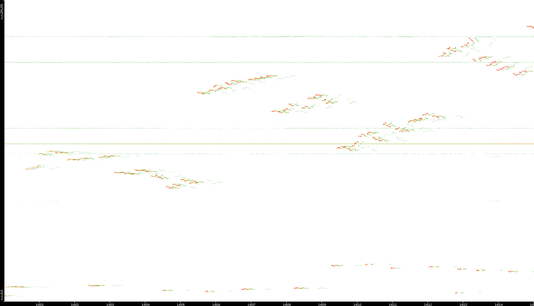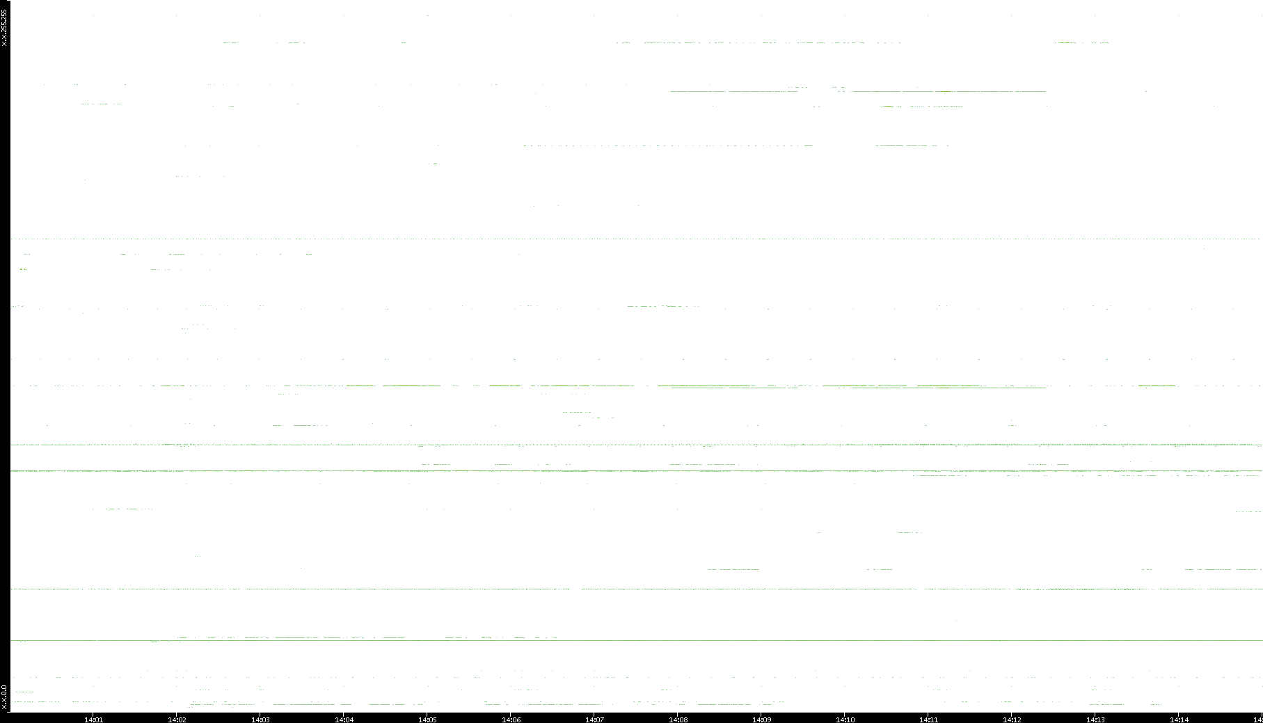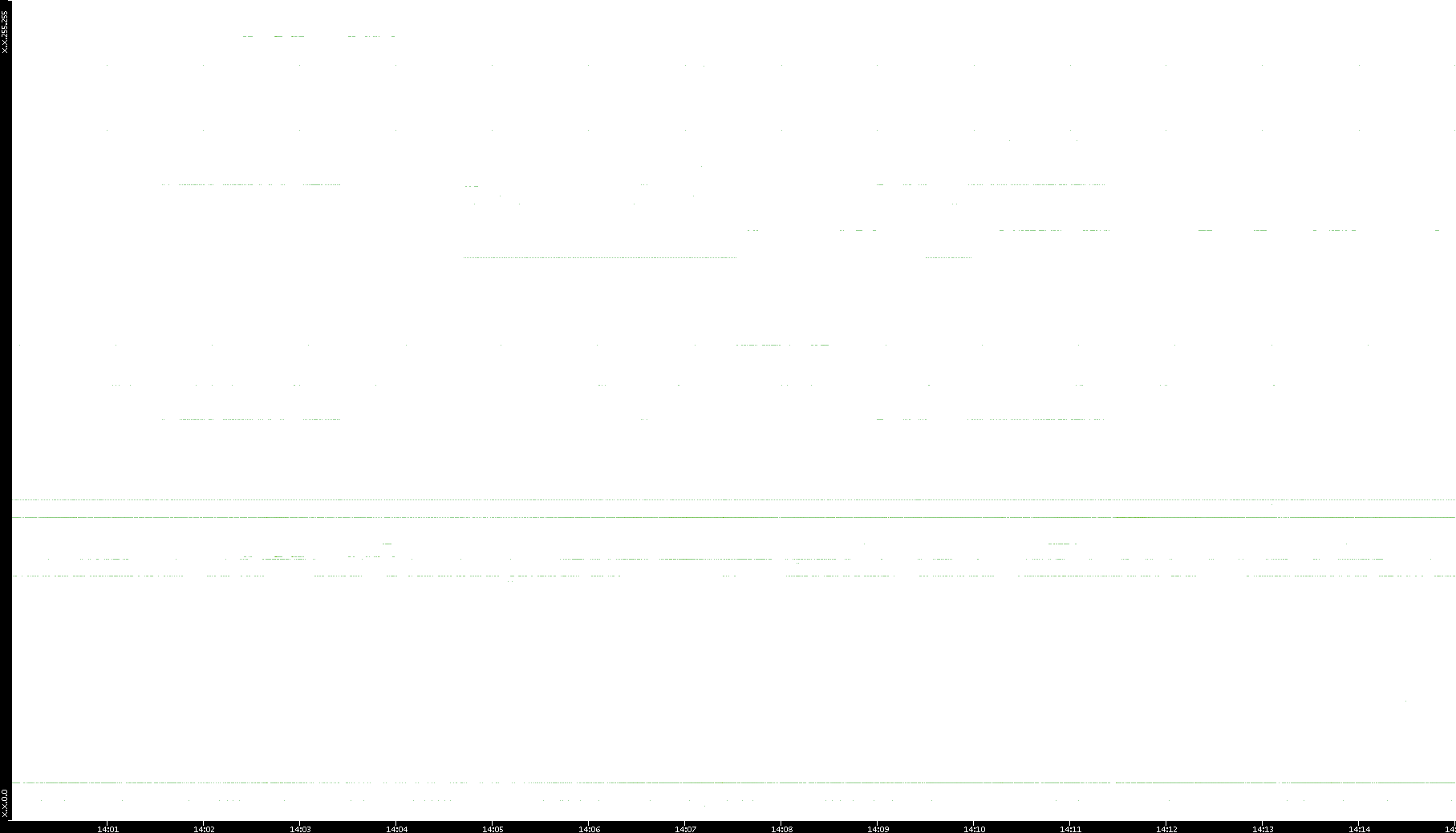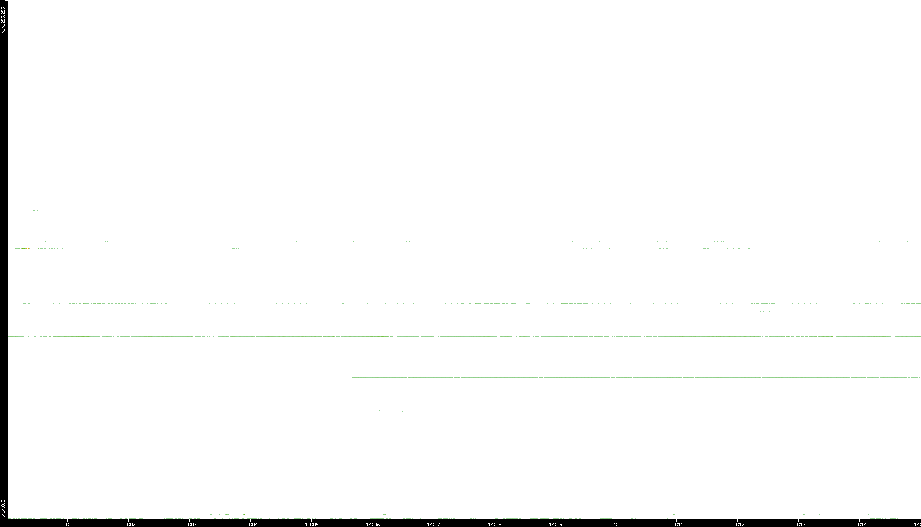2005/07/08 Dest. IP vs. Time Dest. Port vs. Time Src. IP vs. Time Src. Port vs. Time Nb. of Packets vs. Time Throughput vs. Time Average Packet Size vs. Time Entropy of Port vs. Time