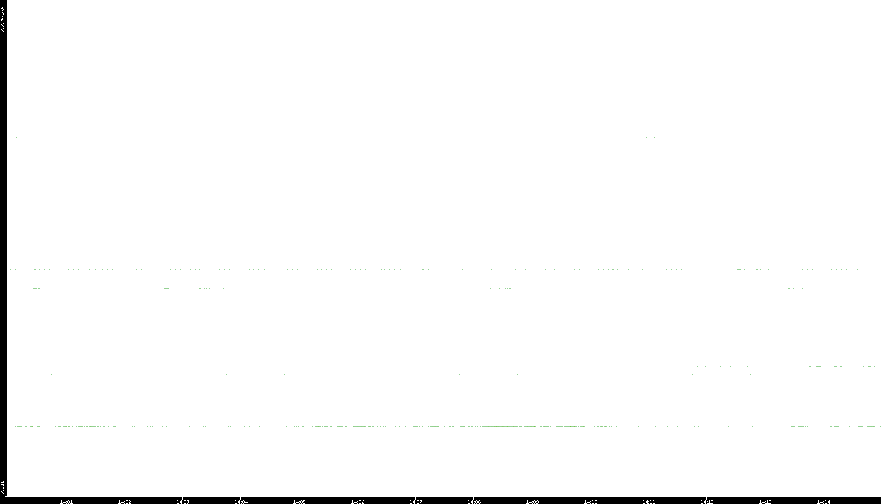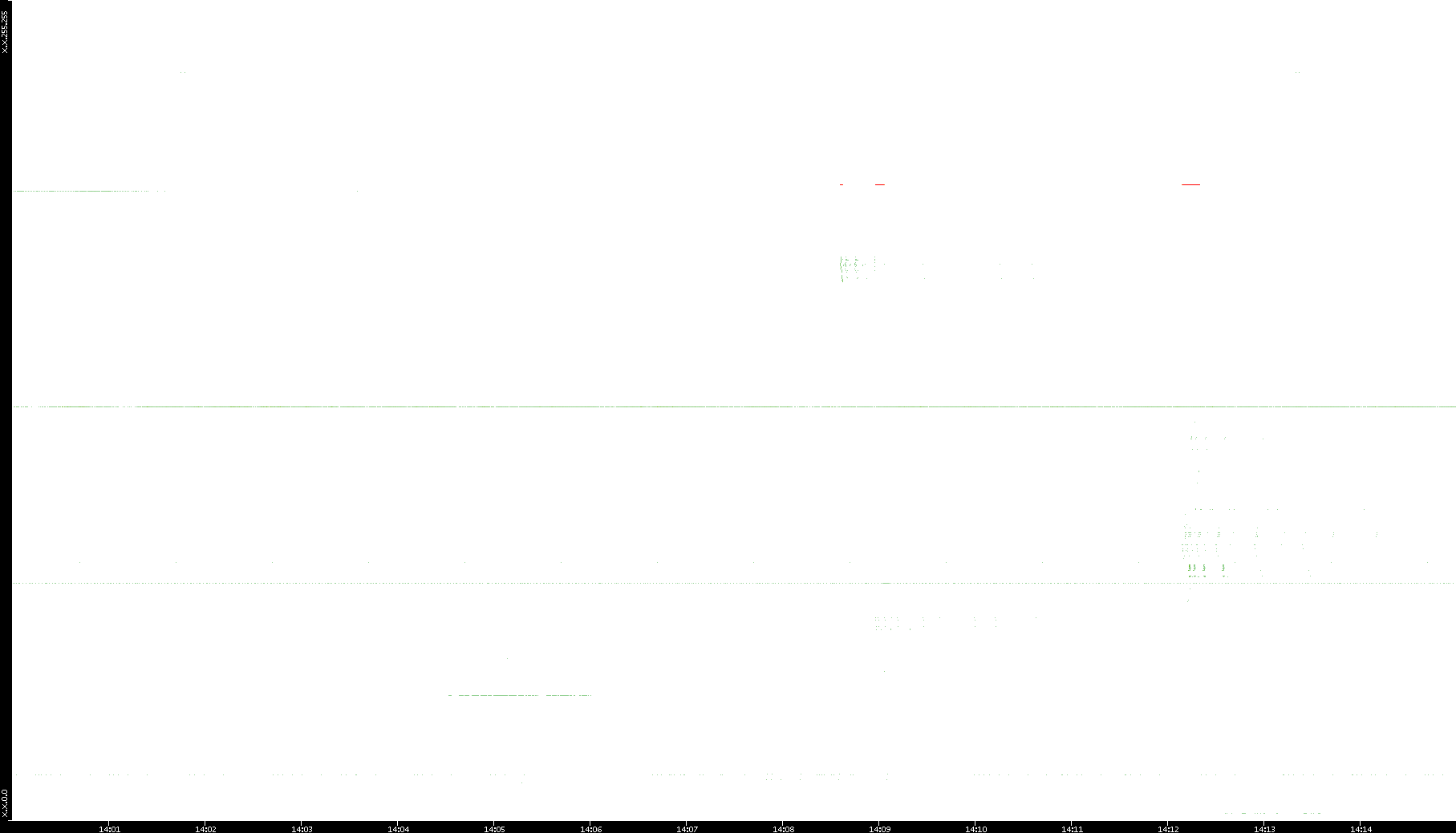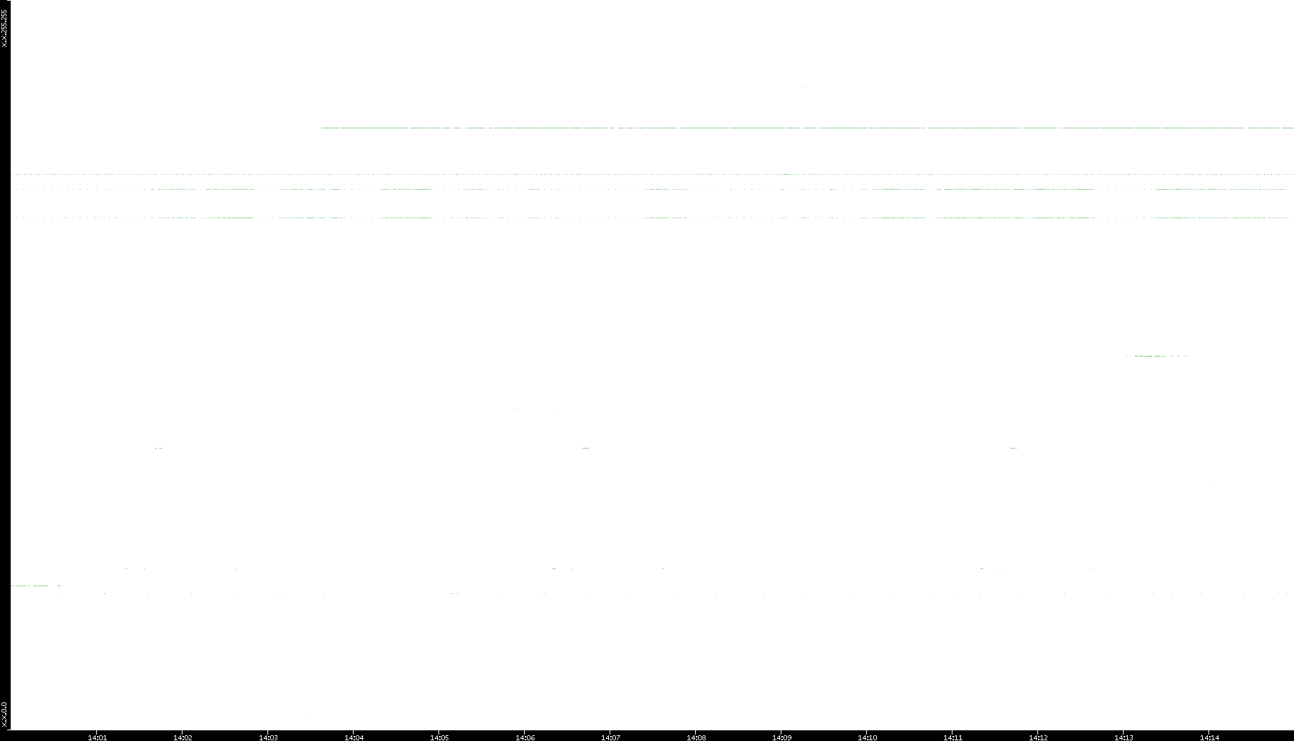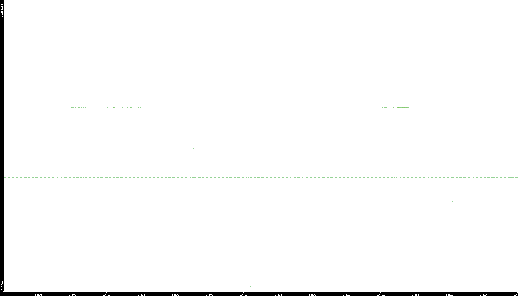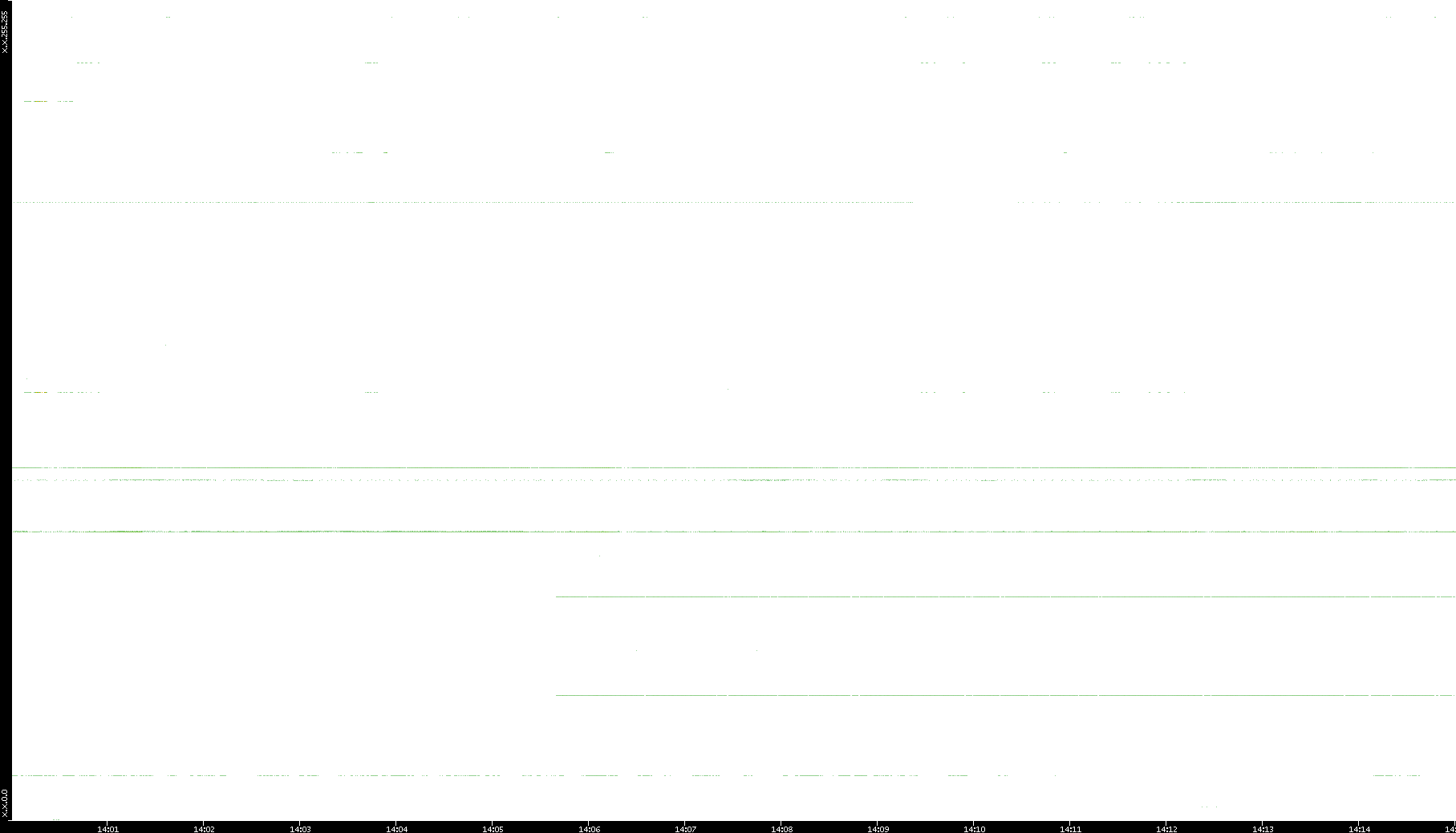 2005/07/08 Dest. IP vs. Time Dest. Port vs. Time Src. IP vs. Time Src. Port vs. Time Nb. of Packets vs. Time Throughput vs. Time Average Packet Size vs. Time Entropy of Port vs. Time