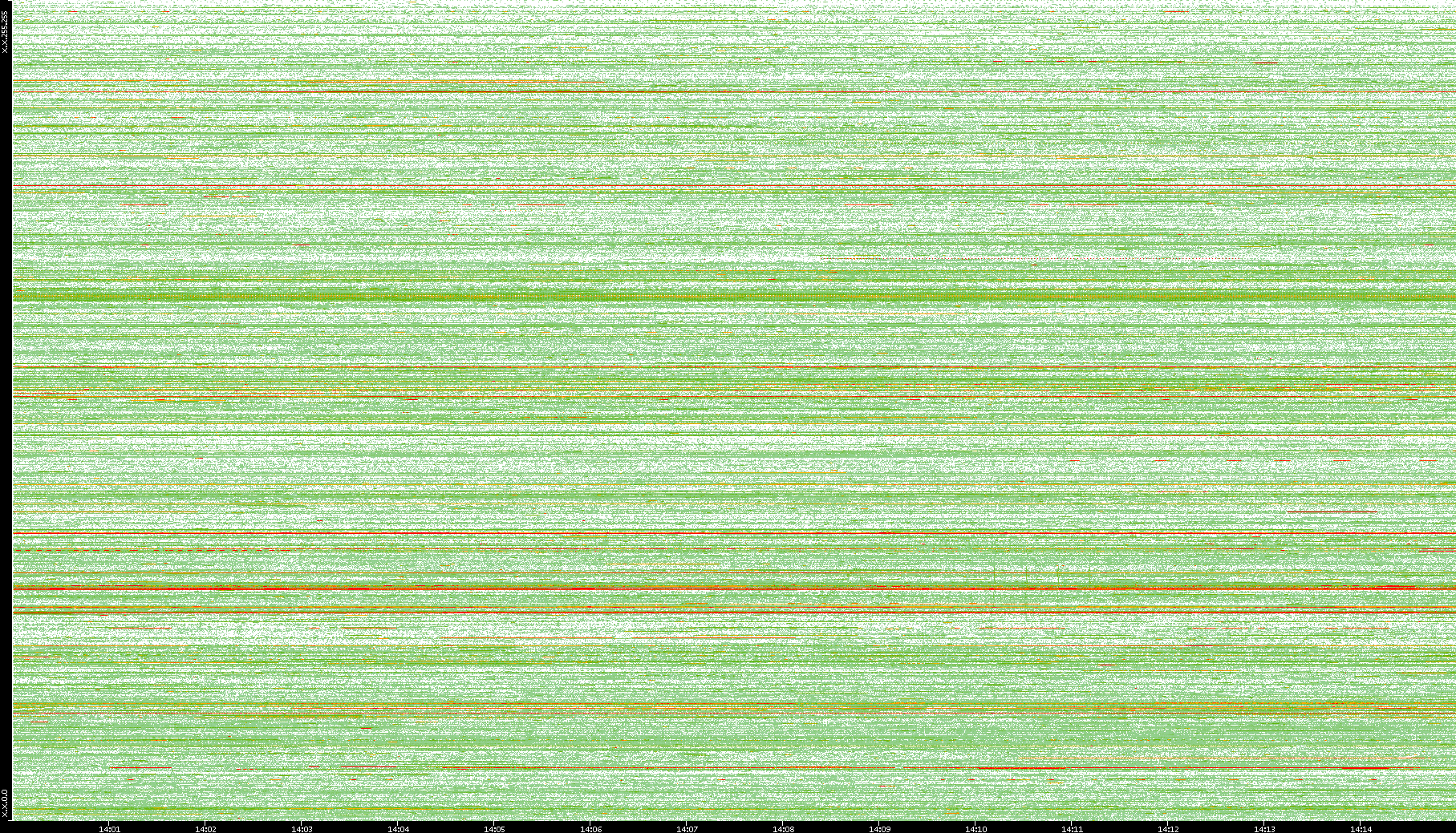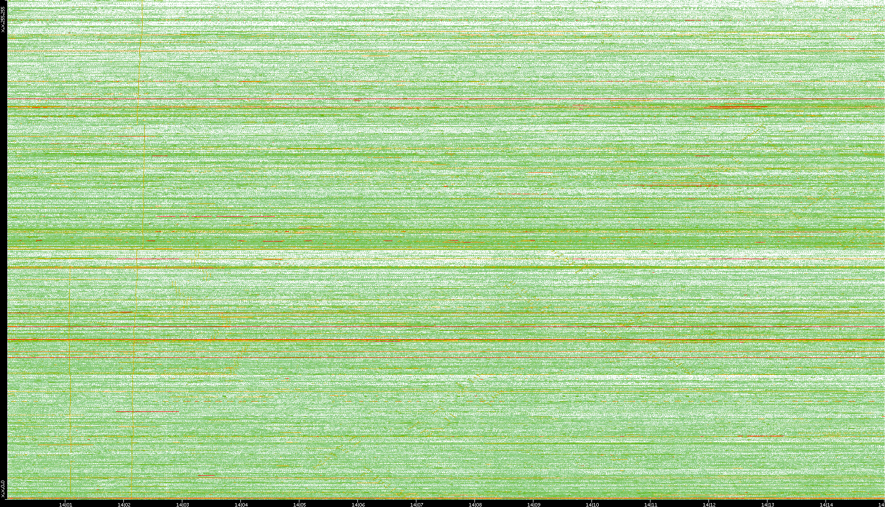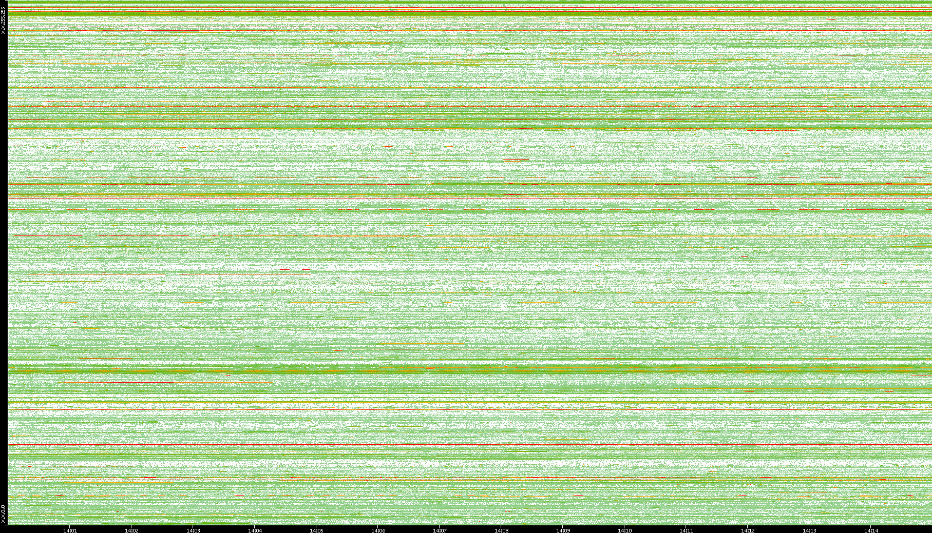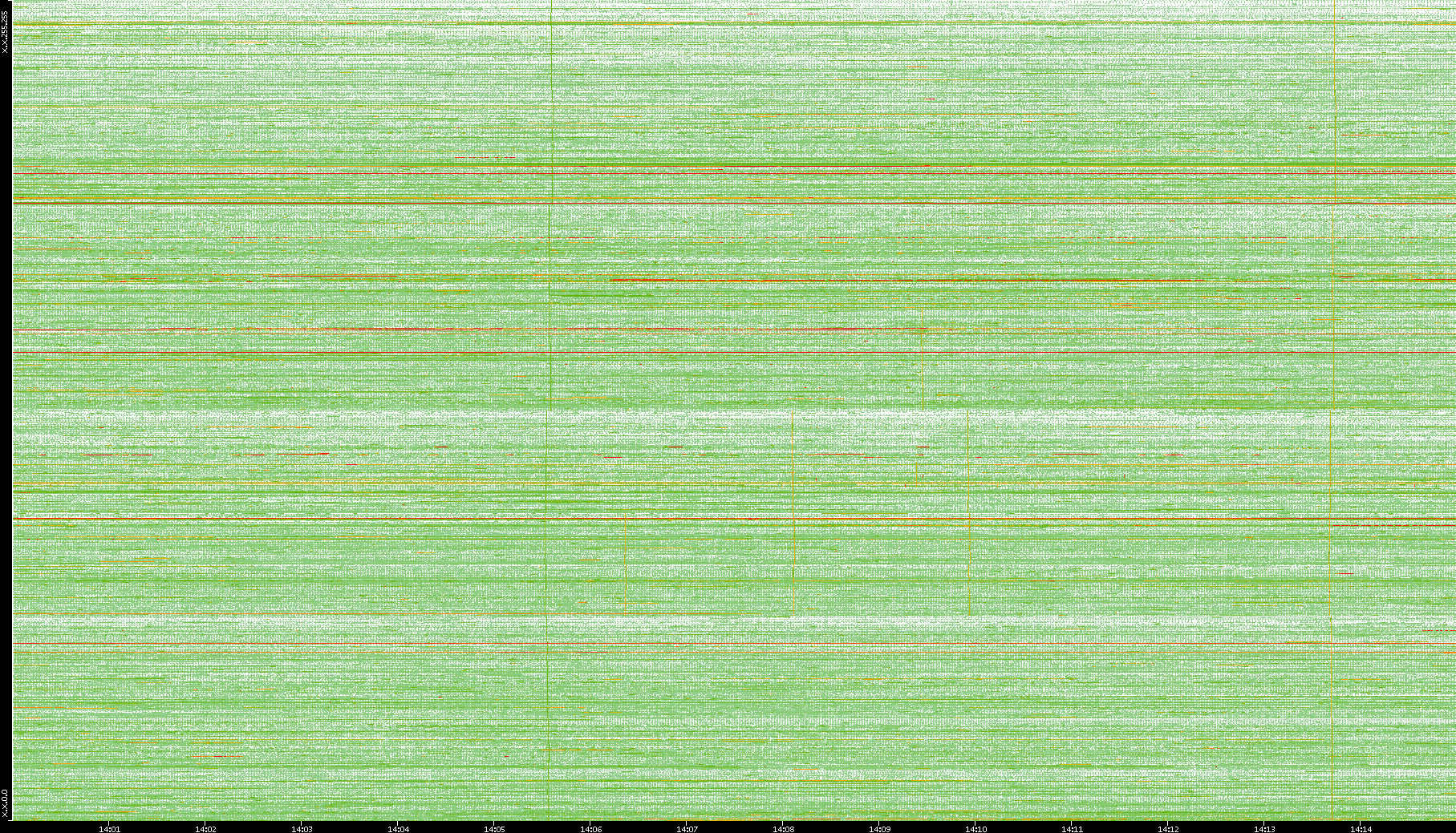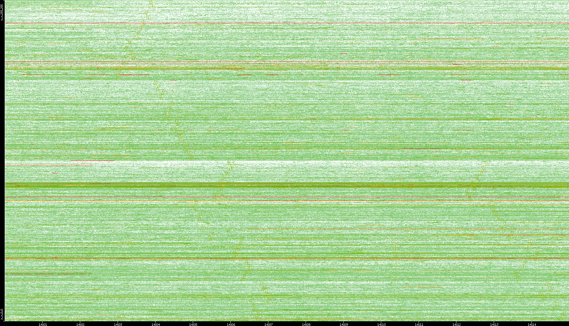 2008/01/14 Dest. IP vs. Time Dest. Port vs. Time Src. IP vs. Time Src. Port vs. Time Nb. of Packets vs. Time Throughput vs. Time Average Packet Size vs. Time Entropy of Port vs. Time